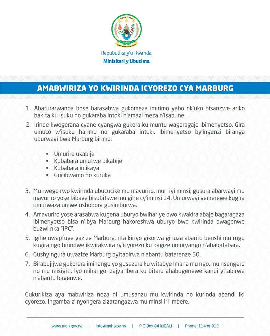 Muri ayo mabwiriza harimo kandi ko mu gihe uwapfuye yazize Marburg, nta kiriyo gihuza abantu benshi ndetse ko umuhango wo kumushyingura witabirwa n’abantu batarenze 50 kandi bikabera mu bitaro ahabugenewe.