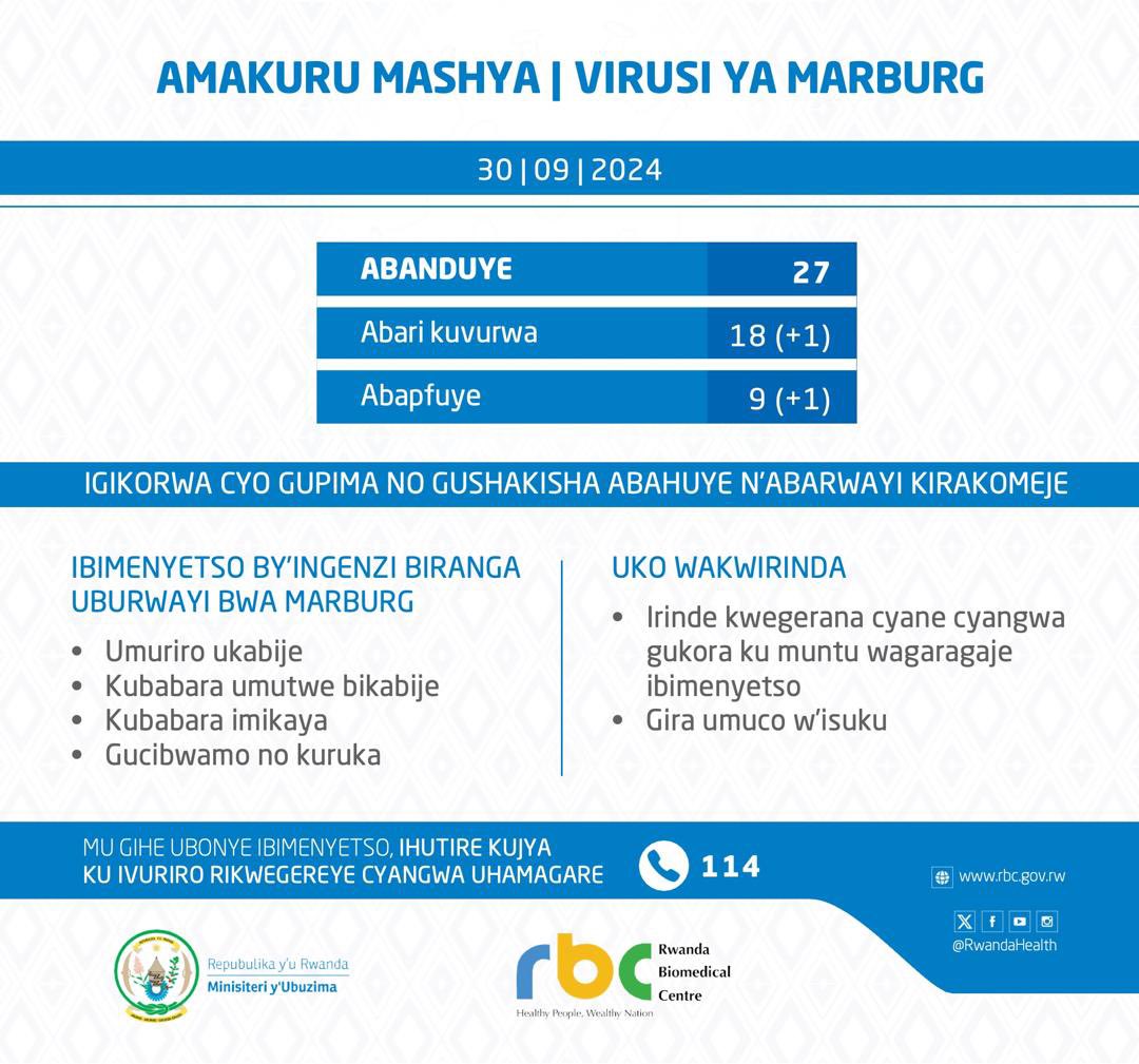 Imibare mishya ya Minisiteri y’Ubuzima mu Rwanda, yatangaje ku mugoroba wo kuri uyu wa Mbere tariki 30 Nzeri 2024, yagaragaje ko umubare w’abantu bamaze kwicwa n’icyorezo cya Marburg wageze ku 9 mu gihe abandi 18 barikuvurwa.